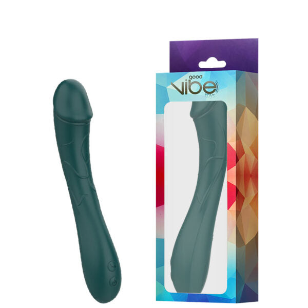 Vibrador recarregável com detalhe de glande. Possui 10 modos de vibração.