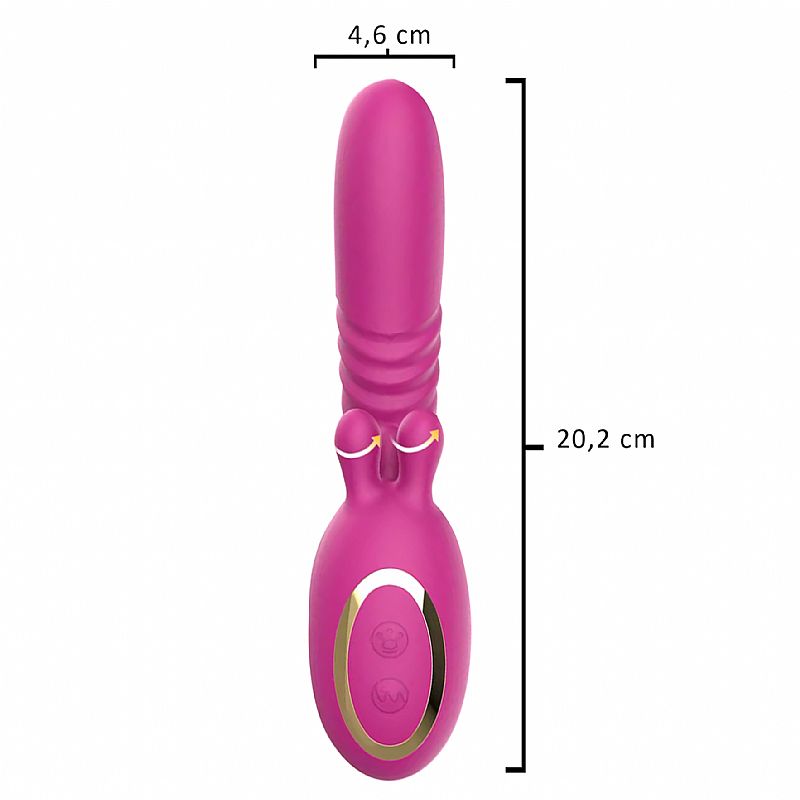 Vibrador de ponto G - possui 9 Modos de vibração no ponto G com vai e vem e 9 Modos de rotação no clitóris. O produto é macio ao toque ergonômico e articulável, o que facilita o manuseio e a estimulação, trazendo uma sensação prazerosa do uso.